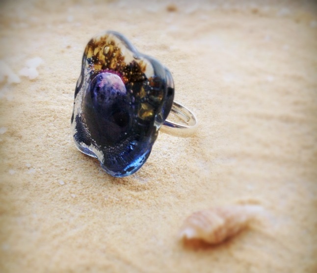 - Bague en forme de pétales,violet et ambre bullé, support de bague plaqué argent réglable,Prix 15€