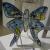 Papillon,bandes et morceaux de verre dichroïque fusionnés,assemblé au plomb ,antennes en fil d'argent et perles de verre bleues pour les yeux, systéme d'accrochage au dos